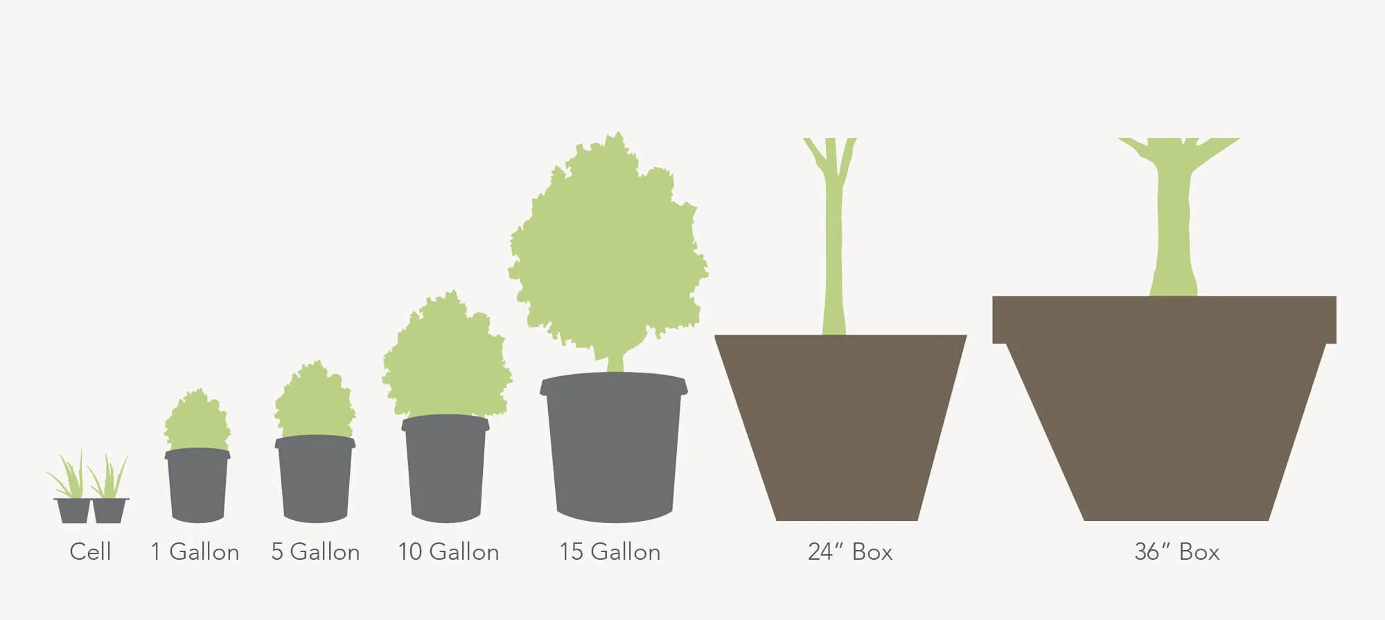 You may find the same plant variety in different sizes. In common nursery potting, each size up is usually one additional year of growth. Larger plants will be more expensive.