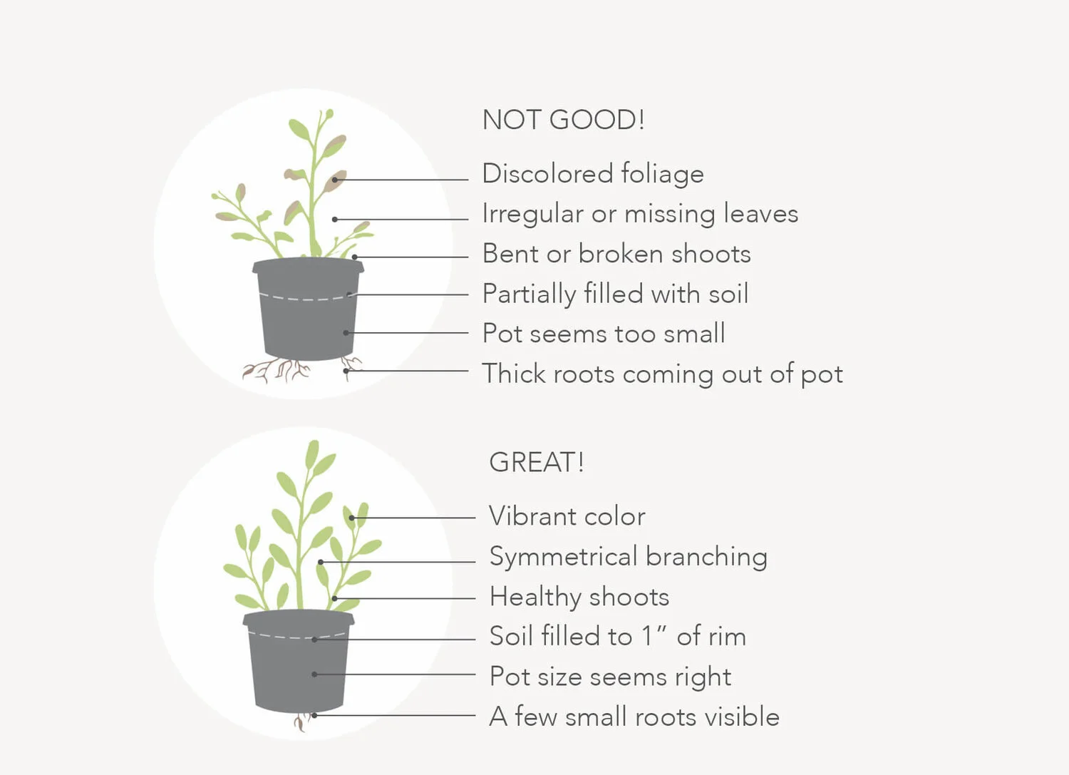 Give each plant a careful inspection before purchasing. Trust your gut: if it looks unhealthy under the optimal conditions of a nursery, it likely won’t thrive in a newly landscaped space.